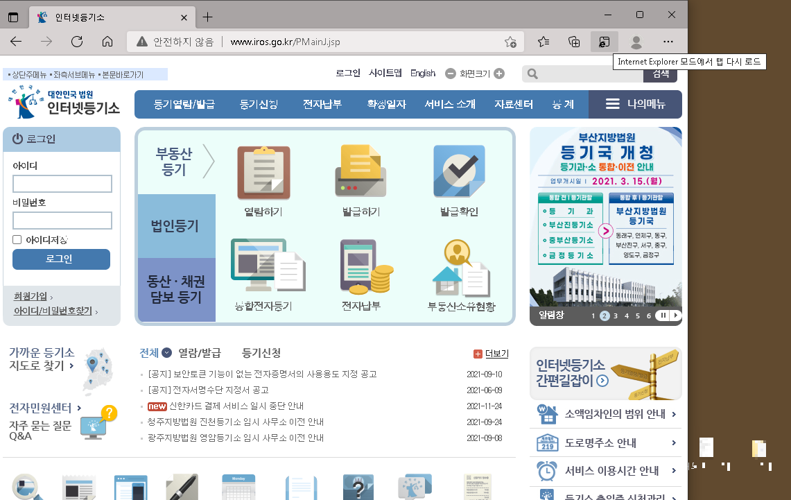 이렇게 원하는 사이트에 왔으면, 오른쪽 상단에 [internet explorer모드에서 탭 다시 로드] 라는 아이콘이 보이죠?
